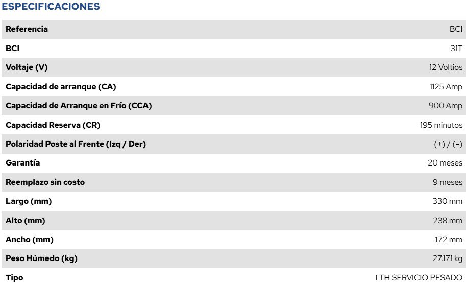 El acumulador LTH L-31T-900 AR cuenta con 20 meses de garantía y cuenta con la tecnología patentada POWERFRAME en rejilla positiva, cumpliendo los requerimientos y capacidades eléctricas de equipo original.